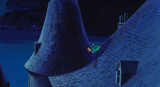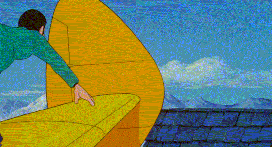 And the characters scramble through the gaps and over the ledges of the villain’s castle in a very real way. The shots emphasize the space, and Lupin and company navigate that space literally. Around the time Cagliostro began, Miyazaki wrote of Mr. Bug’s “superior spatial composition.” You feel the same in his film.