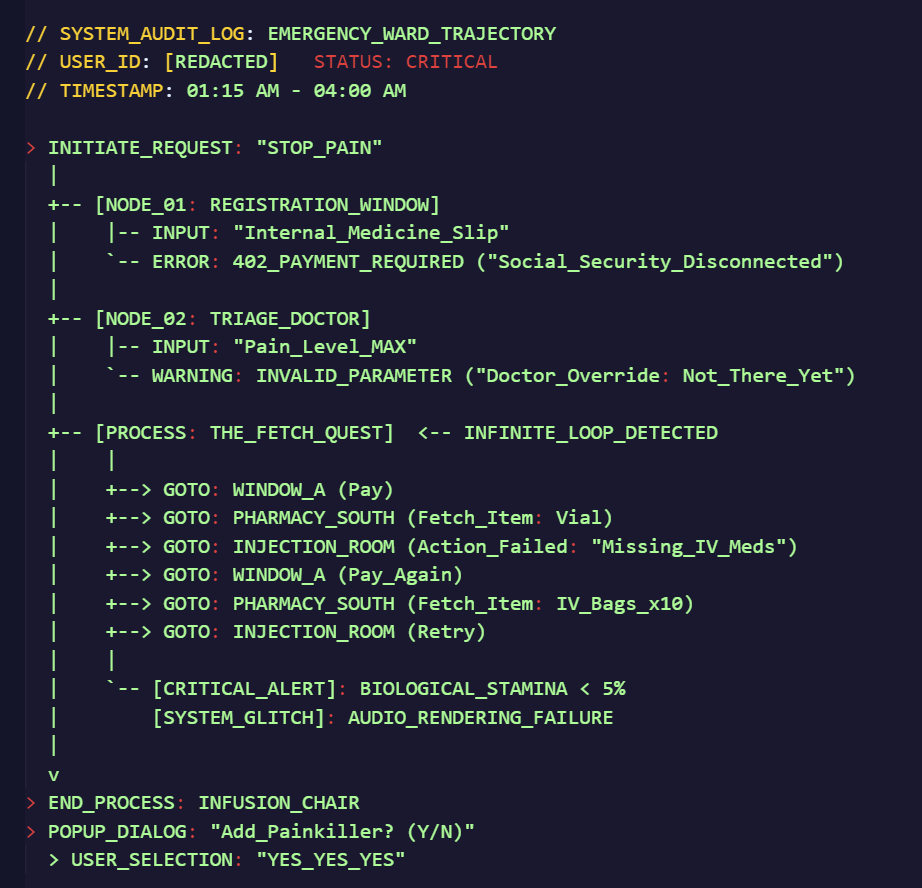 This is a path designed to punish the “weak.” The system assumes a “Single User” cannot initiate an ER session independently; it defaults to the requirement of a Healthy Companion (preferably a Family Unit).