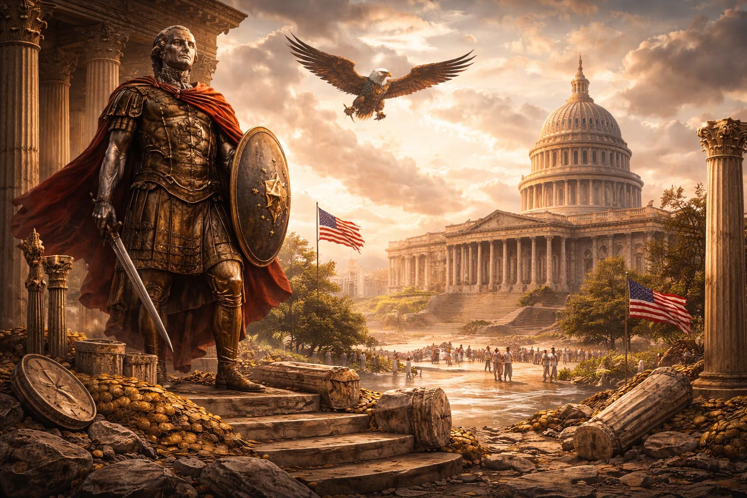 America was consciously founded as a New Rome. The Founders studied Roman history obsessively, borrowing its republican ideals, symbols, architecture, and warnings. The Capitol, the eagle, Latin mottos, and the Senate were not aesthetic choices but ideological ones. America saw itself as Rome reborn wiser, restrained, immune to imperial decay. Yet Rome itself believed the same thing.