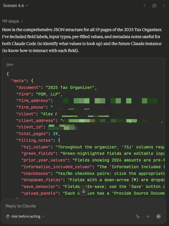 Thankfully years of being a PM at very early-stage startups has made me scrappy and resourceful in solving problems like this. The solution: have Claude in Chrome run through the document, creating a JSON representation of all the fields, give that to Claude Code to complete, then give the completed version back to Claude in Chrome and have it fill out the form. Let’s see if it works!