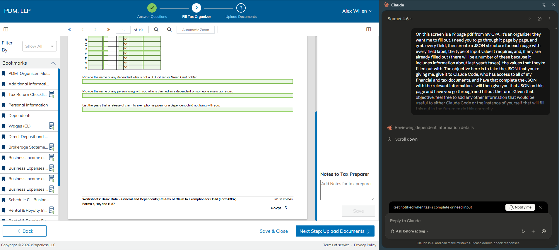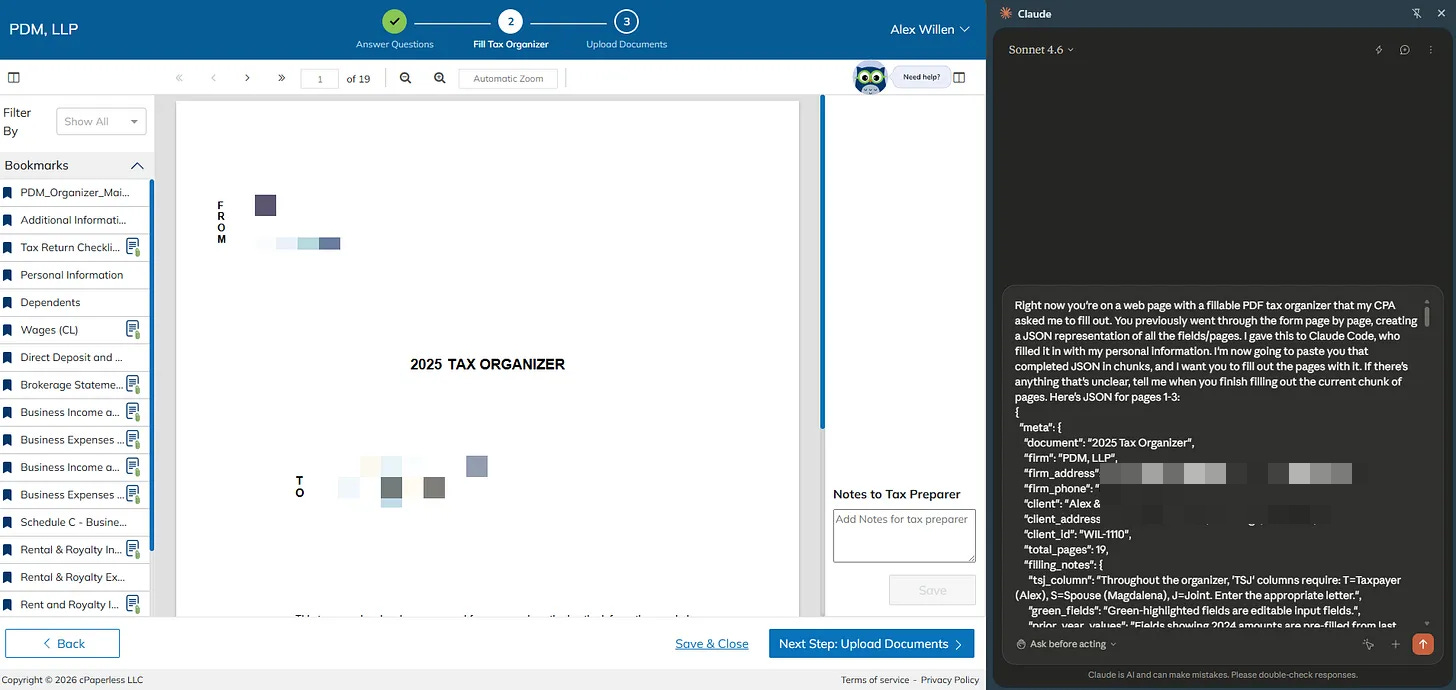 Except I immediately encountered a problem. The organizer PDF is embedded in their web application, and there’s no way to get it out. I asked if they could send me a fillable copy of it; apparently they do not have one. I considered asking for just a non-fillable version, which they clearly must have, but I figured that would defeat the purpose — this fillable version is almost certainly linked to their tax prep software, such that the values populate wherever they need to be automatically. If I just had Claude overlay text on a non-fillable version and sent that back, they’d still have to transpose the data.