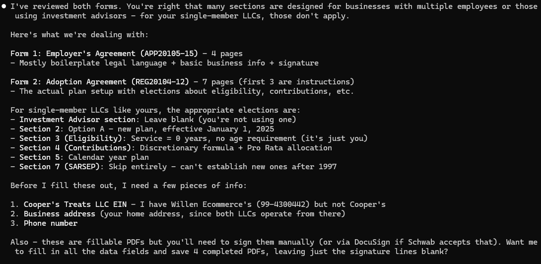 I reminded it that it has my entire return from 2024 which definitely has the answers it asked for, and it got to filling. While it was doing that, I printed off the signature page for each form, signed and scanned it. When Claude was done and asked it to put them in the PDFs. SEP-IRA application forms complete!