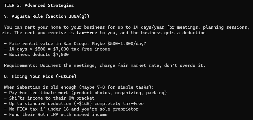 These seem sketchy as hell and let me say I am here for it. Hiring my kids but making sure I “pay for legitimate work!” Love it. I now know what it’s like to have an LLM give me a wink and a nudge. Renting my house to myself! I asked if taking video calls counted and it said that was a gray area, so in 2026 I will be inviting my investors to my home for fund updates.