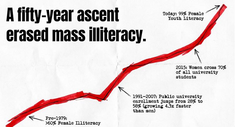 The women doing the leaving are the same women who outcompete their peers globally in STEM, who fill doctoral programs at rates matching the United States, and who went from 60% illiteracy to 99% youth literacy in under fifty years.