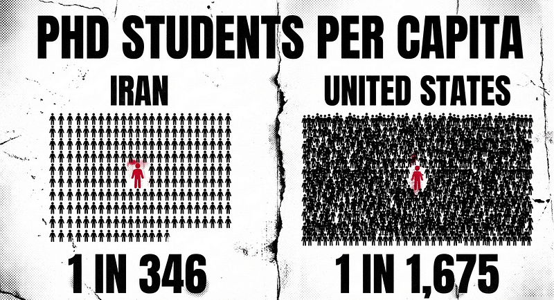 That is 1 in every 346 Iranians enrolled in a PhD program right now. In the United States, with roughly 200,000 doctoral students across a population of 335 million, the figure is 1 in every 1,675 Americans. Iran has nearly 5 times more PhD students per capita than the United States.