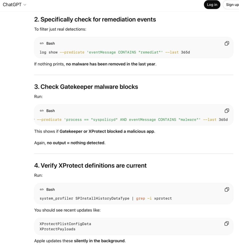 Even for an advanced user, confident assertions made by an AI can mislead. Here’s an example taken from ChatGPT’s advice on potential detections of malicious software. For this I have set ChatGPT’s output in italics, together with its commands as code. It’s worth noting that each command was explicitly given for the bash command shell, although in macOS Catalina (in 2019) Terminal changed to use zsh rather than bash as its default.