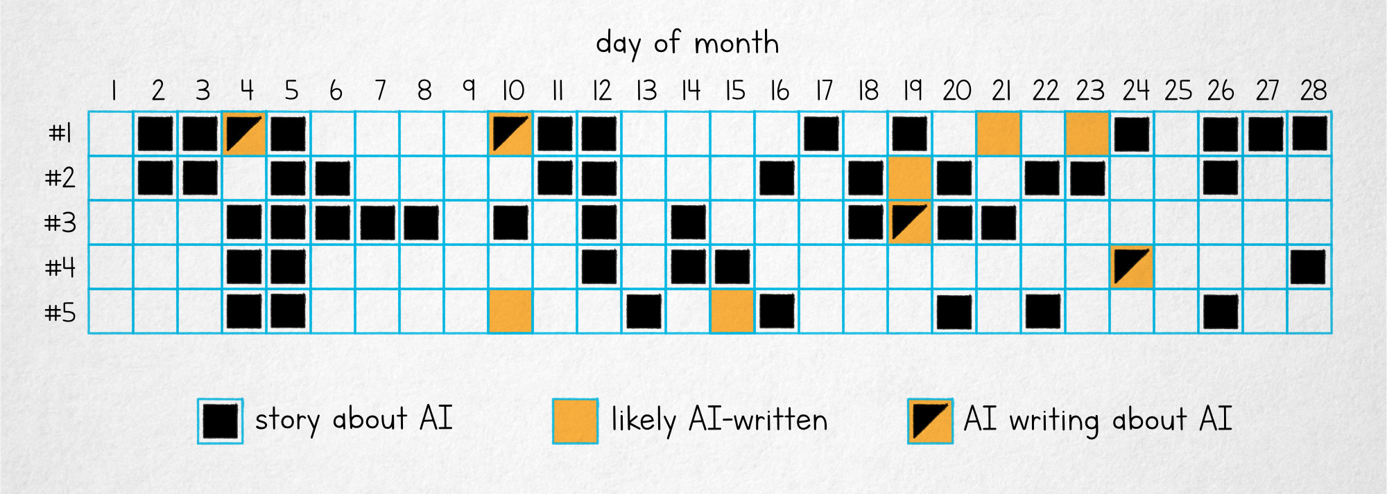 So, yep. AI took four out of five spots on Feb 4 and Feb 12, plus arguably the entire line-up on Feb 5 (story #3 was submarine marketing for an AI vendor). The only days without LLM news in the top 5 were February 1 (with the first AI story at #7, then #9), February 9 (first at #8), and February 25 (with AI at #6, #9, #10).